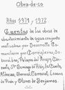 OBRA-DE-CO Años 1971 y 1972 Cuentas de las obras de abastecimiento de agua conjunto realizadas por Desarrollo Comunitario por Torreiglesias, Sotosalbos, Pelayos del Arroyo, Tenzuela, Santo Domingo de Pirón, La Cuesta, Aldeasaz, Berrocal, Carrascal, Losana de Pirón y Otones de Benjumea. MEMORIA El secretario que suscribe tiene el honor de presentar a la Junta General de Aguas (OBRA-DE-CO) las cuentas de ingresos y gastos de las obras realizadas con motivo del abastecimiento de agua conjunto a Torreiglesias, Sotosalbos, Pelayos del Arroyo, Tenzuela, Santo Domingo de Pirón, La Cuesta, Aldeasaz, Berrocal, Carrascal, Losana de Pirón y Otones de Benjumea, obras realizadas por Desarrollo Comunitario, y cuya liquidación se refleja en los pliegos que encabezan dichas cuentas, pero para que la Junta pueda obrar con mas elementos básicos para su aprobación, si procede, hagamos un poco de historia y las aclaraciones consiguientes. Me fueconferido el honroso cargo de Secretario de ésta Junta en sesión celebrada el día 21 de Diciembre de 1.970, en el pueblo de La Cuesta, por los distintos representantes de los pueblos anteriormente mencionados que componen la Comunidad como igualmente ese mismo día se confirieron los cargos de Presidente a Don Antonio Sacristán Sanchez, y de Depositario a Don Ildefonso María Velasco, los tres como Claveros hemos procurado llevar el cargo con espíritu de sacrificio y con la buena feque en todo momento ha presidido nuestros actos. El primer asiento verificado en ingresos en la contabilidad de esta junta fueel 25 de Enero de 1.971 y el primer pago el 17 de Febrero de dicho año, durante el transcurso de dos años se han verificado ciento cinco anotaciones en gastos que corresponden a otros tantos libramientos o mandamientos de pago y ha habido cincuenta y cuatro cargaremes o mandamientos de ingreso correspondientes a otros tantos ingresos, la cantidad total de pagos o gastos liquidados durante expresado periodo ha sido de SEIS MILLONES SEISCIENTAS SETENTA Y UNA MIL CIENTO SESENTA Y SIETE PESETAS.- (6.671.167) y en ingresos la cifra de SEIS MILLONES SEISCIENTAS NOVENTA Y SIETE MIL CIENTO SESENTA Y NUEVE PESETAS lo que nos da una existencia o superávit, ya que en el caso actual es la misma, al no haber crédito pendientes de pago, ni tampoco de ingresos; de VEINTISÉIS MIL DOS PESETAS (26.002). Se han pasado muchas penurias económicas, hasta el punto de haber tenido que recurrir a préstamos de Entidades Bancarias, habiendo respondido de los mismos, representantes de cada Comisión, los préstamos han sido por un valor total de UN MILLÓN QUINIENTAS CINCUENTA MIL PESETAS, que se han ido verificando amortizaciones parciales, habiendo sido la última el día 22 de Noviembre de 1.972, no debiendo por consiguiente cantidad alguna, habiendo importado los intereses de dichos préstamos así como la renovación y protexto de letras la cantidad de SESENTA Y DOS MIL CIENTO SESENTA Y CUATRO PESETAS (62.164), todo ello según se describe en el detalle del cuadro que se une a las cuentas. Se han recibido las siguientes subvenciones, UN MILLÓN DE PESETAS de la Excma. Diputación, UN MILLÓN CUATROCIENTAS CINCUENTA Y UNA MIL QUINIENTAS OCHENTA Y DOS PESETAS del Servicio de Planes Provinciales de la Presidencia del Gobierno, DOSCIENTAS VEINTICINCO MIL PESETAS de la Dirección General de Trabajo por medio del Gobierno Civil para mitigar el paro involuntario en las obras, y DIEZ MIL PESETAS de la Caja de Ahorros y Monte de Piedad como ayuda para la recepción ofrecida en la inauguración de las obras; a todos éstos organismos y todos los demás que no solamente nos han ayudado, sino que han colaborado tan eficazmente les expreso en éstas mal hilvanadas lineas mi profundo agradecimiento ya que con su ayuda económica y su apoyo moral han aliviado la situación económica que en algunas ocasiones se ha atravesado. La aportación en metálico de los pueblos ha sido de DOS MILLONES DOSCIENTAS CINCUENTA Y NUEVE MIL NOVECIENTAS TREINTA Y NUEVE PESETAS (2.259.939) según se refleja por cada pueblo o núcleo en el estado de cuentas. La aportación personal muy aproximada y casi exacta ha sido de SEISCIENTOS OCHENTA Y SEIS JORNALES, distribuidos de la siguiente forma.- TORREIGLESIAS.- 296.- La Cuesta y sus barrios 180.- Otones de Benjumea 101; Losana de Pirón.- 35; Sotosalbos.-30; Pelayos del Arroyo.-24; Santo Domingo de Pirón 16.- y Tenzuela 12; esto solamente se refiere a la cañería general o conducción general, y no a las lineas secundarias que es propio de cada pueblo o núcleo urbano. Para el arreglo de las averías, muy escasas, de la cañería general ha sido preciso transportar arena y llevar tubos, que lo han realizado tractores de Torreiglesias, La Cuesta y Otones de Benjumea, por medio de la prestación de transportes. La obra como el principio se indica de Desarrollo Comunitario debido a su cuantía, casi asegura esta Secretaría habrá sido la mas importante que se haya realizado en España, digno de destacar el espíritu de compenetración de los distintos pueblos pertenecientes a la Comunidad al principio expresados, cuyos vecinos sin regatear sacrificio alguno han puesto todo su esfuerzo para llegar a dar fin a una obra que nadie de los habitantes de los pueblos podía soñar y mucho menos realizar. No quiero hacer mas larga esta memoria porque considero que con las cifras expuestas y las reflejadas en los estados que se unen a las cuentas son suficientes elementos de juicio para que la Junta General pueda dictaminar sobre las mismas.